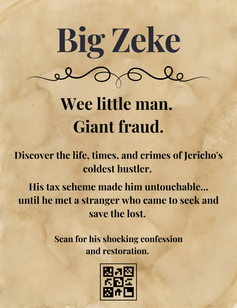 If I were actually executing this project, I’d create a website page with either a video or article that tells the full story of Zacchaeus and shifts the focus from the true crime aspect to his genuine repentance and subsequent generosity.